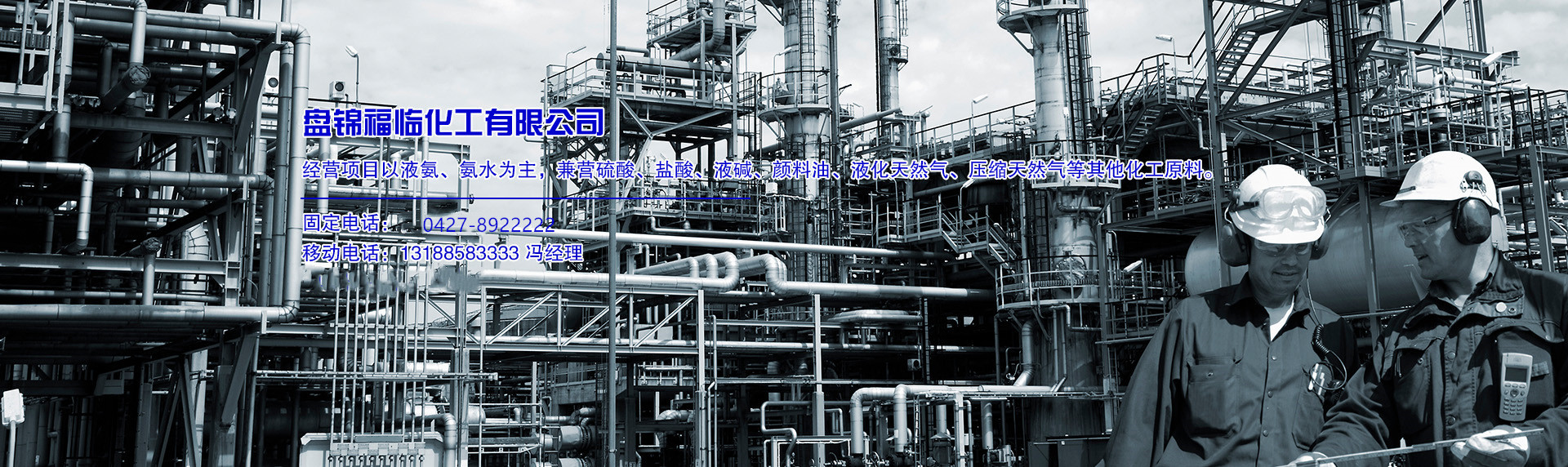 盤錦福臨化工有限公司,成立于20115月份,經營項目以液氨、氨水為主,兼營硫酸、鹽酸、液堿、顏料油、液化天然氣、壓縮天然氣等其他化工原料。本公司是一家從事化學品經營的企業,現有職工20余人,專業技術人員3名。現有液氨槽車4臺。氨水車2臺。液氨鋼瓶30多個,產品暢銷遼寧省內外。